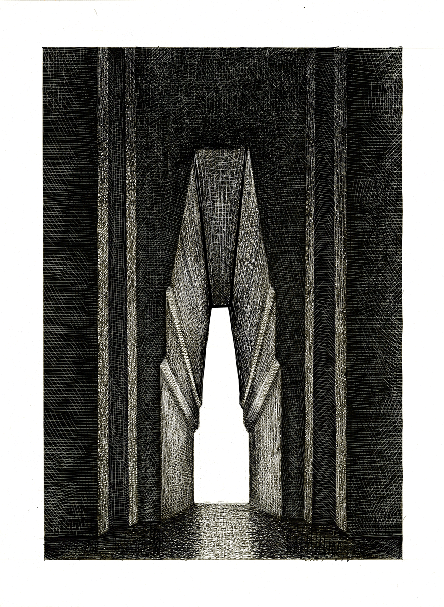 Illustrations and Models — Earlier tests of other styles — Trapezoidal doorway — scratchboard and Adobe software, 2002