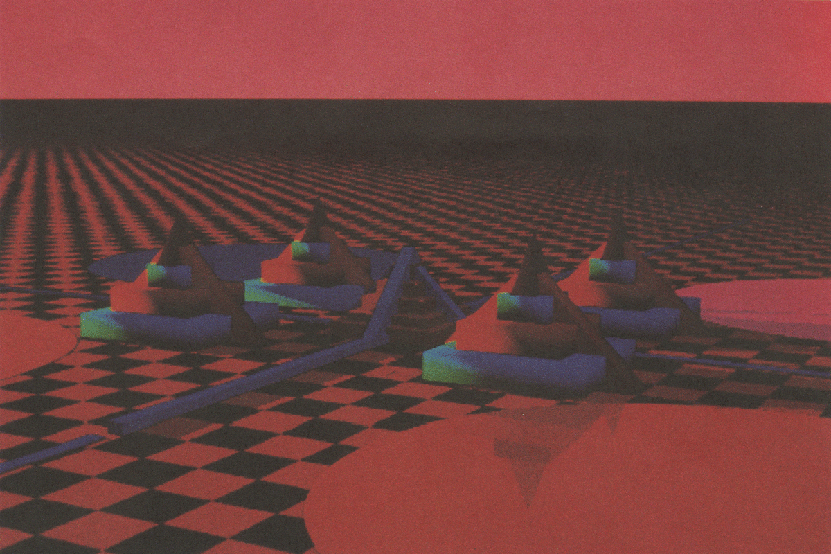 —Pyramid and set designs from Softworlds 1.1, The Sacrifice Game — Ix, five central muls -- Sculpt 3D software, 1992