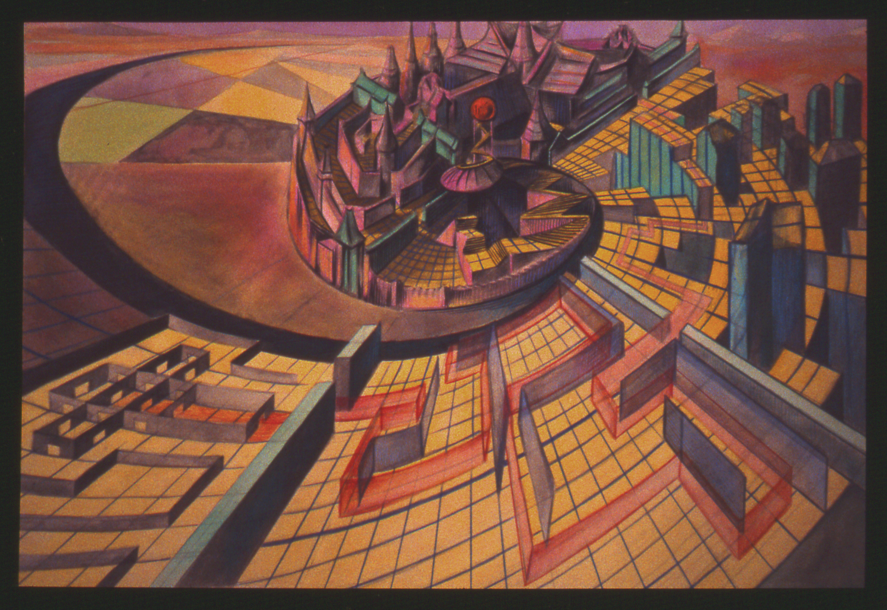— The Imperial Message, Set concept with go grid, inks and pastels, 22"x18", 1993